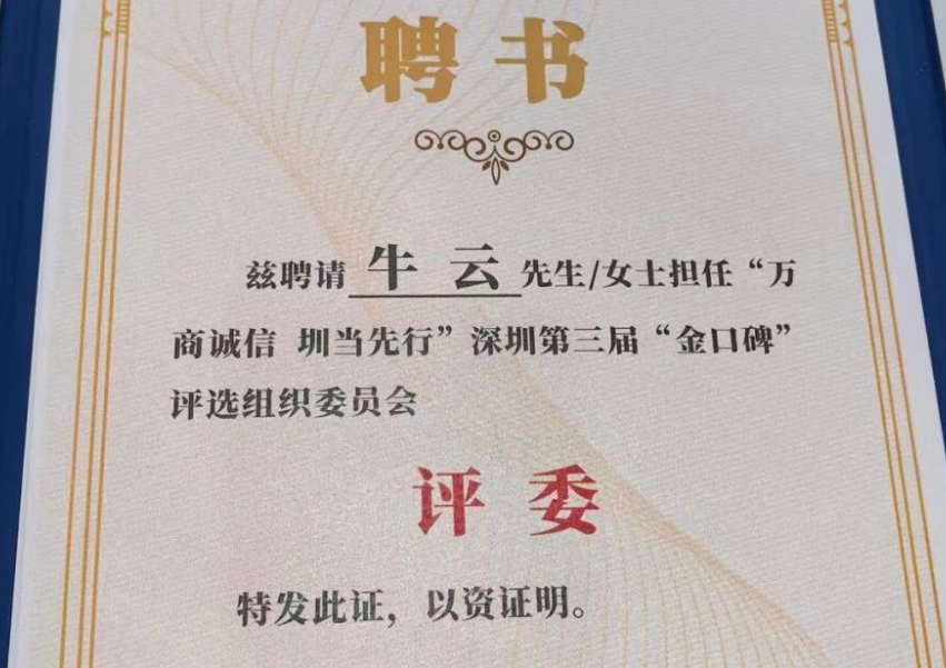 萬商誠信,圳當先行 | 牛云老師受聘為深圳第三屆“金口碑”評委